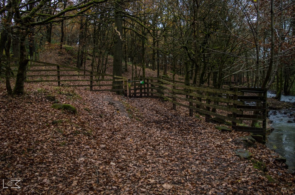 Take this footpath and head towards the gate. Pass through the gate and continue along the footpath until you see a small gate appear to the right of the path in between the path and the stream, leading into some woodland.