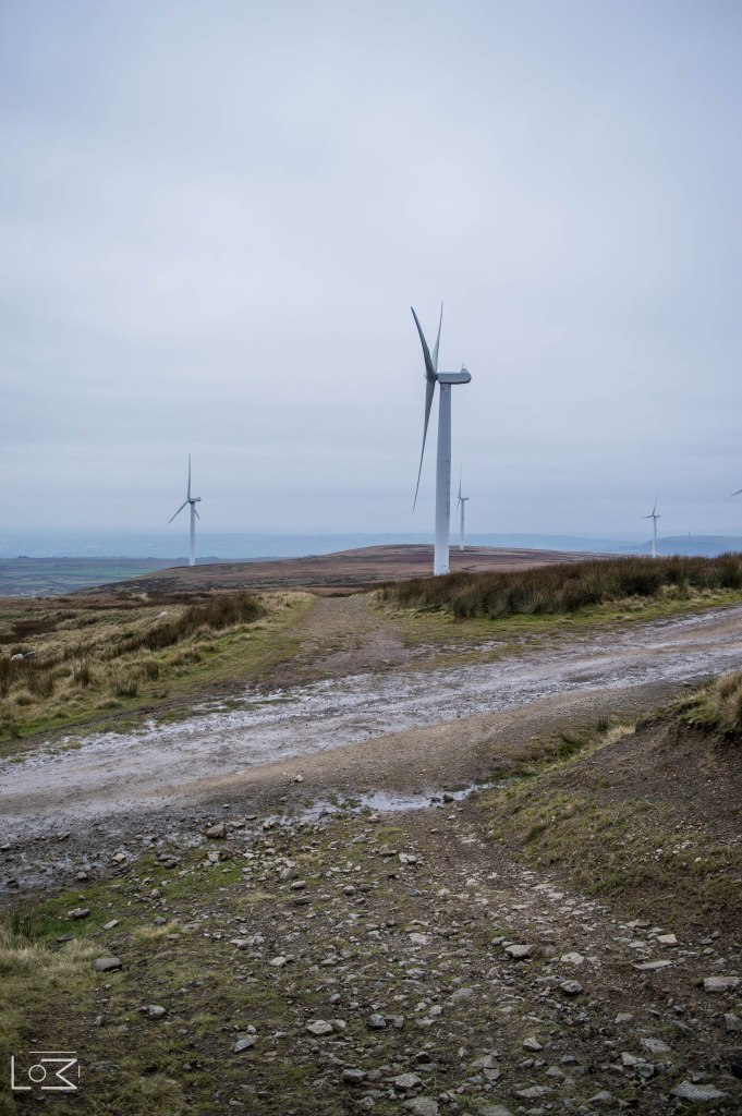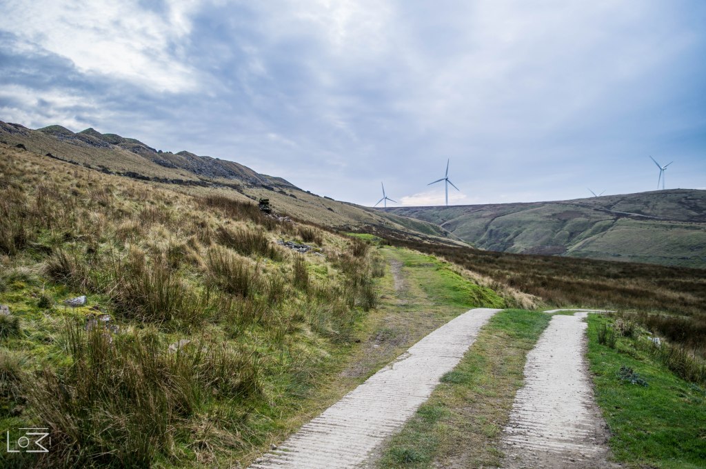Follow this path until it reaches a junction in the service roads for the wind farm.