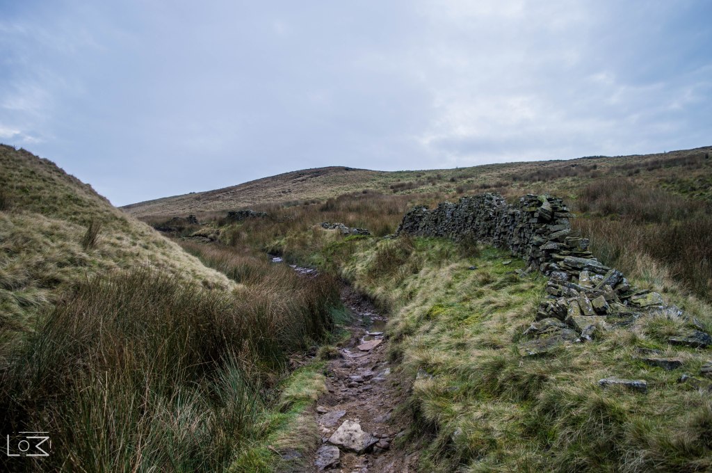 Cross the stream and follow the path up the opposite side of the valley. As it follows the crumbling dry stone wall.